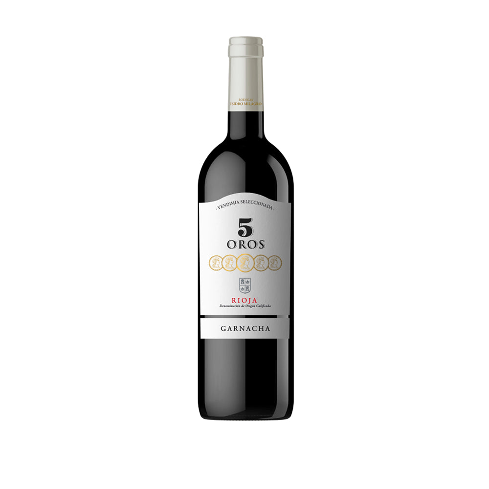O 5 Oros Vendimia é um vinho tinto jovem e expressivo, elaborado exclusivamente com a uva Garnacha, proveniente de vinhedos de produção controlada situados entre 300 e 650 metros de altitude. A fermentação ocorre em tanques de aço inoxidável com controle rigoroso de temperatura, seguida de uma maceração de 8 a 10 dias com leveduras selecionadas, preservando ao máximo o frescor e a autenticidade da variedade.